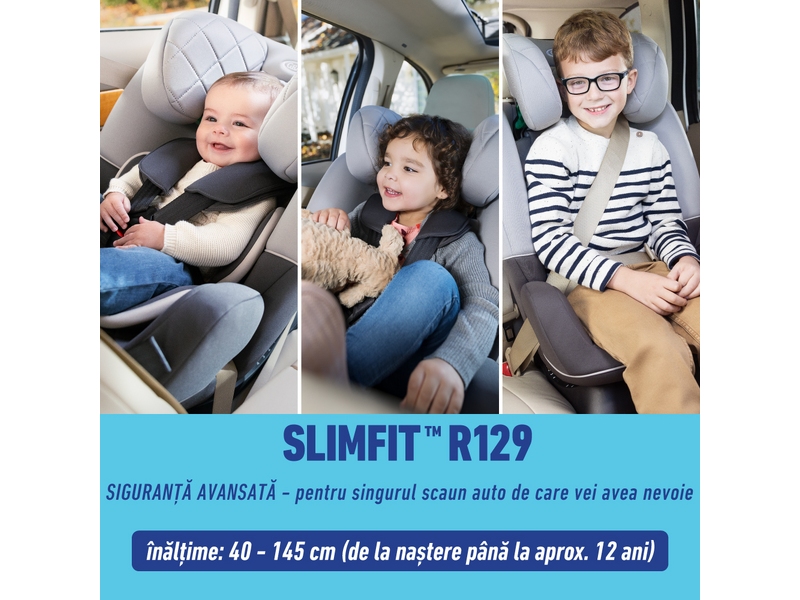 Cel mai popular scaun auto Graco indeplineste acum cele mai recente standarde europene de siguranta ECE R129. Graco SlimFit i-Size a fost supus mai multor teste de impact lateral, este clasificat in functie de inaltime si mentine copilul cu spatele la sensul de mers mai mult timp – de la nastere pana la 105 cm (aproximativ 4 ani).