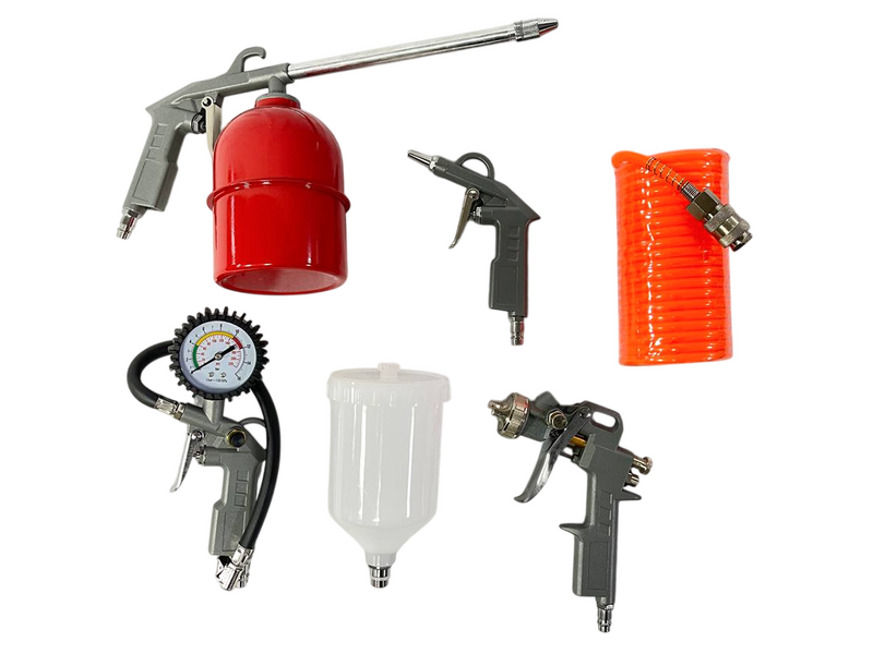 Acest set oferă versatilitate maximă și este compatibil cu majoritatea compresoarelor standard. Ideal pentru vopsire, curățare, umflare și spălare.